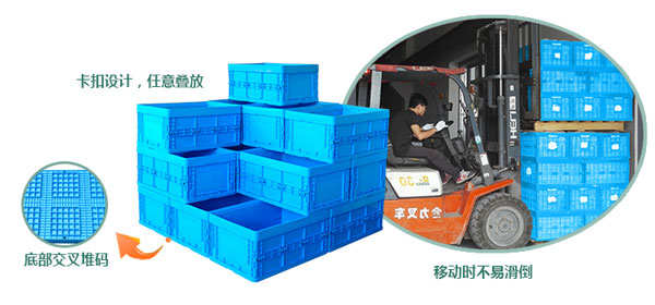 5、防滑放倒:箱子底部交叉堆碼,卡扣設計,任意疊放,防止箱子在移動時因堆高而易滑倒